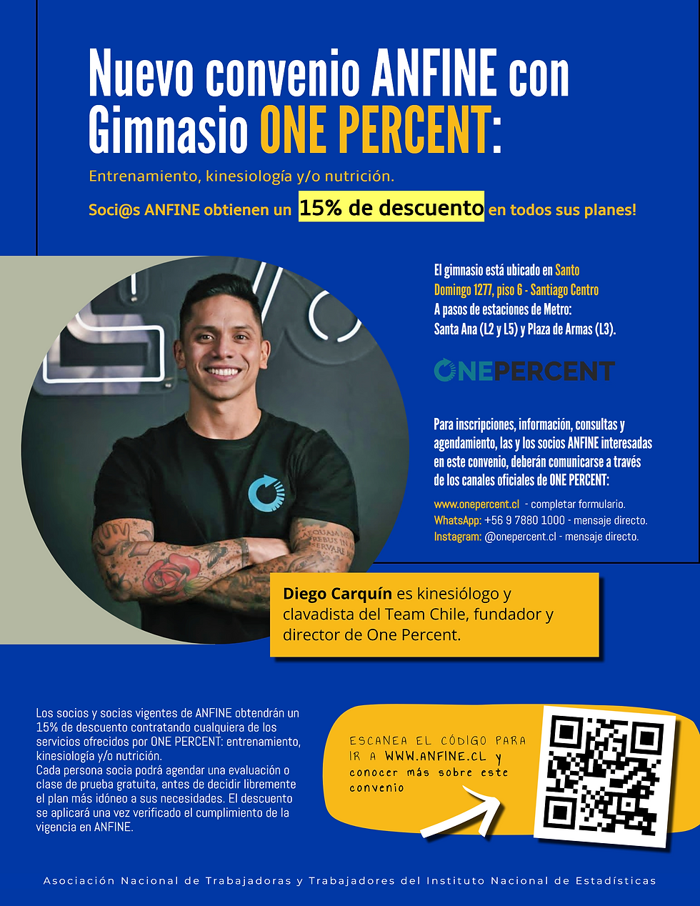 ANFINE informa a sus socias y socios vigentes sobre este nuevo convenio con ONE PERCENT, que contempla un 15% de descuento en servicios de entrenamiento personalizado, rehabilitación kinésica y nutrición deportiva. Además, cada persona podrá acceder a una evaluación o clase de prueba gratuita antes de elegir el plan que mejor se ajuste a sus necesidades. El beneficio se aplicará previa validación de vigencia en ANFINE y no es acumulable con otras promociones. Para inscripciones, información, consultas y agendamiento, las y los socios ANFINE interesadas en este convenio, deberán comunicarse a través de los canales oficiales de ONE PERCENT: